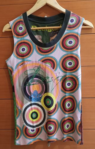 Camiseta estampada y sin mangas de Desigual, talla M. 100% algodón.