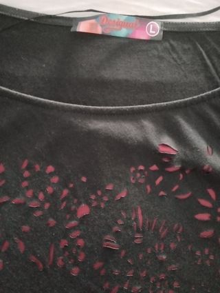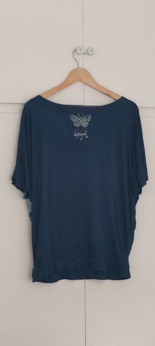 Camiseta Desigual con manga amplia. Es talla L pero da mucha talla (48-50). Cuello barco muy amplio, cómoda, fresquita y muy combinable.