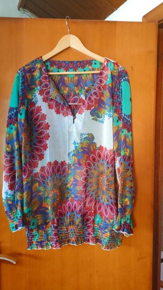 Preciosa blusa de la marca Desigual, talla L. Es una prenda alegre y colorida, ideal para primavera/verano. - Diseño estampado con flores y motivos geométricos. - Confeccionada en una tela suave y ligera. - Corte favorecedor.