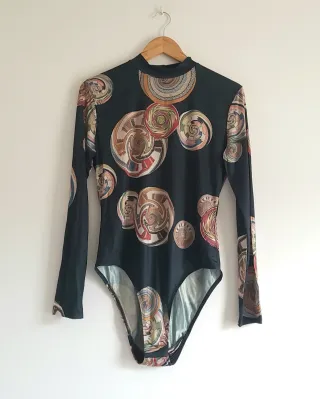 Body de manga larga con un llamativo estampado retro. - Diseño de círculos concéntricos. - Cuello alto. - Tejido elástico.