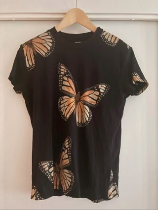 Camiseta de canalé con un estampado de mariposas. - Diseño de manga corta. - Cuello redondo. - Tejido acanalado.