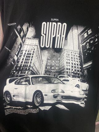 Camiseta negra con estampado gráfico de un Toyota Supra. - Diseño frontal con el logo SUPRA y coches. - Detalle de TOYOTA y MK4 en la parte superior. - Estilo oversized.