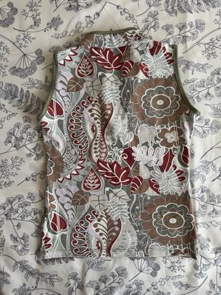 Camisa NUEVA A ESTRENAR con un diseño muy especial y elegante que combina rayas verticales con un estampado floral estilo matrioska con un toque vintage. LA TELA ES UN POCO ELÁSTICA Y SE ADAPTA MUY BIEN A LA FORMA DEL CUERPO.Talla L,52 cmt de sisa a sisa. Tengo más diseños de ropa complementos bolso calzados collares anillos pendientes muy originales en mis anuncios. - Mangas estilo farol. - Cuello alto. - Estampado de rosas y flores pequeñas.