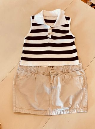 Este top de punto sin mangas evoca la moda de los años 60 con un diseño a rayas clásico y detalles elegantes. - Cuello tipo polo. - Tres botones dorados en la parte frontal. - Tejido de punto con rayas horizontales.