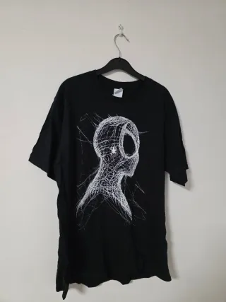 Camiseta negra con un diseño artístico de Spider-Man en blanco. La ilustración muestra la cabeza del personaje con un efecto de telaraña. - Diseño de Spider-Man en blanco. - Estilo artístico y detallado.