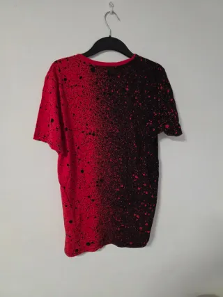 Camiseta con un diseño moderno y llamativo, perfecta para un estilo urbano. - Diseño dividido en dos colores: negro y rojo. - Estampado de salpicaduras en ambas mitades. - Logo de la marca en la parte frontal derecha.