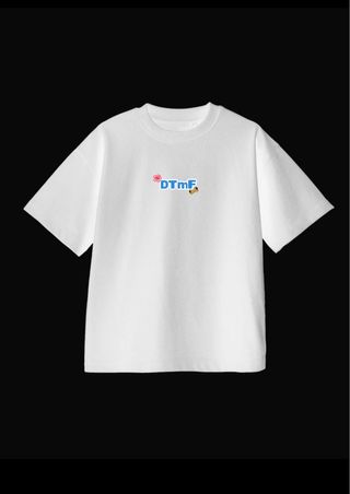 Camiseta blanca con un diseño único en el pecho, ideal para festivales o conciertos. - Diseño con flor y letras 'DTmF'. - Estilo moderno y llamativo.