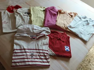 Lote de ocho camisetas de diferentes estilos y colores. - Camiseta blanca con rayas rojas y capucha. - Camiseta roja con escudo. - Camiseta beige con logo. - Camiseta amarilla. - Camiseta rosa. - Camiseta naranja. - Camiseta blanca con cuello de rayas. - Camiseta beige con cuello rojo.
