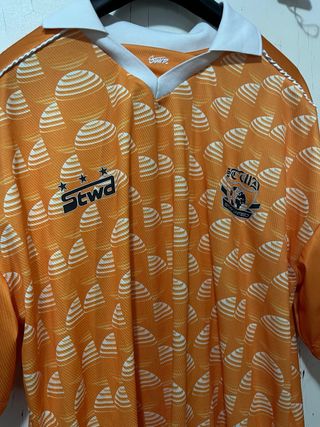 Camiseta de fútbol estilo Selección Española. - Diseño con rayas verticales rojas y detalles amarillos. - Mangas y cuello en azul marino. - Escudo de la selección. - Número 19 estampado en grande. - Talla L y M - Envío rápido y seguro
