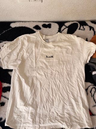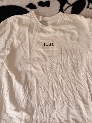 Camiseta de la marca Half en color blanco, talla XL, 100% algodón. Diseño minimalista con logo pequeño en el pecho y estampado gráfico grande en la espalda estilo surf/skate (Maverick’s). Cómoda y fácil de combinar para looks casual o streetwear. En buen estado, con uso normal. Tiene una mancha de humedad pero se lava y se va