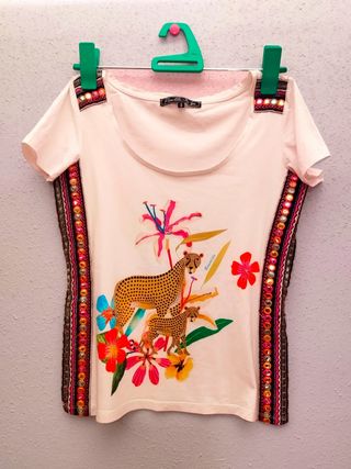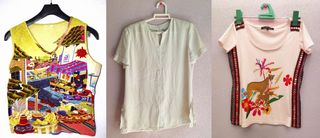 01. Camiseta sin mangas cuadro "El Mercado" de Raúl del Río. Estilo primitivismo moderno costumbrista. Arte folklórico. Comprada en México fronterizo. Vibrante estampado multicolor con lentejuelas. Cuello en V. 100%algodón. Talla L. Medidas: 56largo. 48ancho. Sisa 51. 02. Blusa blanca larga de manga corta. Marca El corte inglés. Escote en V. Talla 46. 100% Poliéster. 03. Camiseta artesanal de colores vibrantes. Estampado tropical de guepardos y flores con abalorios decorativos bordados en laterales y hombros. Marca: Rosalita Mc Gee. Talla S. 100% algodón. Escote redondo. Precio no negociable.