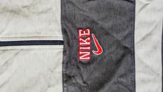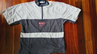 Camiseta de manga corta Nike de estilo vintage, con un diseño de bloques de color.Cremallera rota y un minusculo agujero en la parte de adelante, ver en la foto. - Diseño de bloques de color en gris y azul marino. - Logo de Nike bordado en el pecho. - Cuello con cremallera. - Manga corta.
