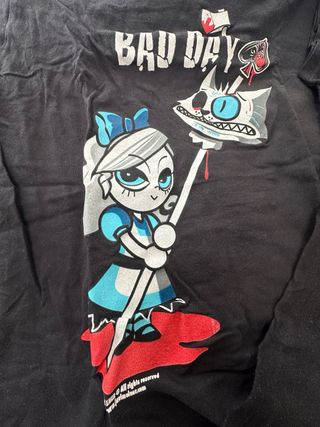 Pack de tres camisetas con diseños Bad Day. - Camiseta 1: Diseño de Blancanieves con manzana. - Camiseta 2: Diseño de personaje estilo Alicia en el País de las Maravillas con gato. - Camiseta 3: Diseño de Caperucita Roja con lobo. En la etiqueta pone talla M pero talla menos