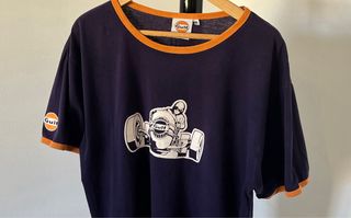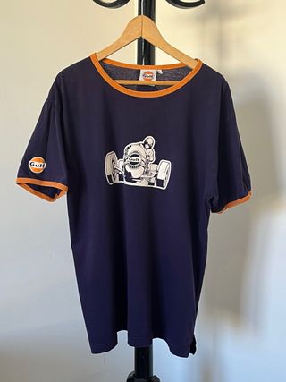 Pone XL pero es pequeña. Camiseta de estilo retro con un diseño inspirado en el automovilismo clásico. - Cuello y mangas con ribete naranja. - Estampado frontal de un coche de carreras. - Logo de Gulf en la manga izquierda.
