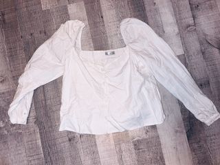 Blusa blanca con un diseño inspirado en la época de Bridgerton. Cuenta con mangas abullonadas y un escote cuadrado. - Escote cuadrado. - Mangas largas abullonadas. - Cierre de botones en la parte delantera.