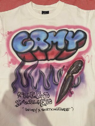 Camiseta blanca con diseño gráfico de Grimey x Shirtkingphade. - Estampado frontal con letras estilo graffiti y cuchillo. - Detalle de llamas moradas y rosas. - Cuello redondo y manga corta.