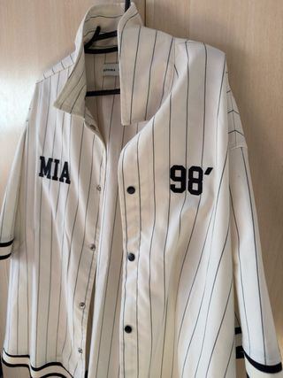 Camiseta estilo béisbol de Bershka con el nombre Miami y el número 98'. - Diseño a rayas blancas y negras. - Cierre de botones a presión. - Cuello camisero.