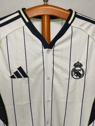 Camiseta de estilo béisbol del Real Madrid. - Diseño a rayas verticales. - Logo de Adidas en el pecho. - Escudo del Real Madrid. - Cuello en V con botones.