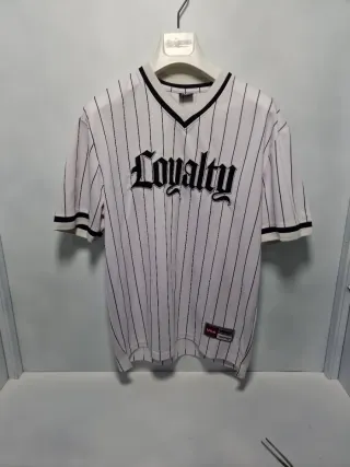Camiseta de estilo béisbol con diseño de rayas finas. - Diseño de rayas verticales negras sobre fondo blanco. - Cuello en V con ribete negro. - Mangas cortas con detalle de ribete negro. - Inscripción Loyalty en la parte delantera.