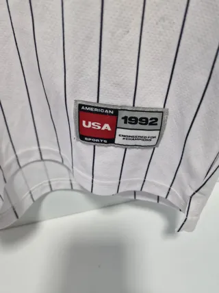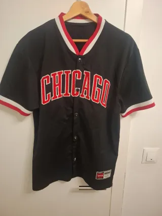 Camiseta estilo béisbol con el nombre Chicago bordado. - Diseño con cuello en V y ribetes. - Mangas cortas. - Talla M - Cierre de botones. - Detalle de etiqueta USA 1992 en la parte inferior.