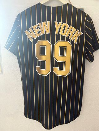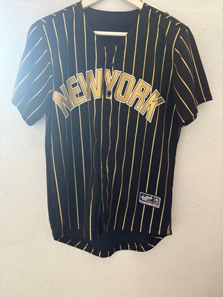 Camiseta estilo béisbol con diseño de rayas verticales y detalles dorados. - Mangas negras. - Inscripción NEW YORK en dorado. - Logo de MLB en dorado y blanco.