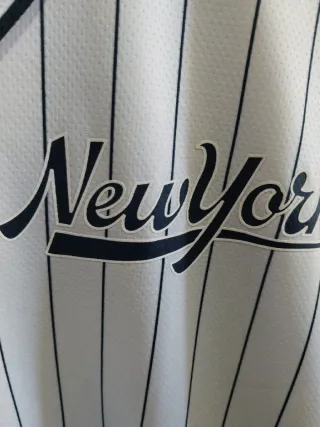 Camiseta de béisbol estilo Yankees de la marca Majestic. - Diseño clásico con ribetes. - Logo de los Yankees bordado en el pecho. - Cierre de botones. - Etiqueta de Major League Baseball.