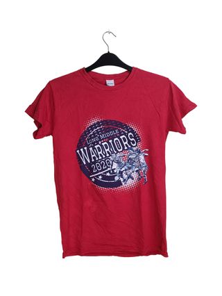 Camiseta roja de manga corta del equipo "Long Middle Warriors" (Edición 2020) con gráfico de fútbol. Estilo deportivo escolar americano. Marca: Gildan Ultra Cotton. Talla: S (Small). Material: 100% Algodón. Estado: LEER BIEN. La camiseta tiene uso. Presenta algunas manchas visibles en la parte trasera y delantera (ver últimas fotos detalladas). No tiene rotos, pero no está impoluta. Ideal para deporte, estar por casa o trabajos manuales. Medidas: (Recomiendo medir ancho y largo y ponerlo aquí). Prenda lavada. Envío rápido 📦. ¡Pregunta si tienes dudas! #soccer #futbol #warriors #schoolteam #2020 #gildan #redtee