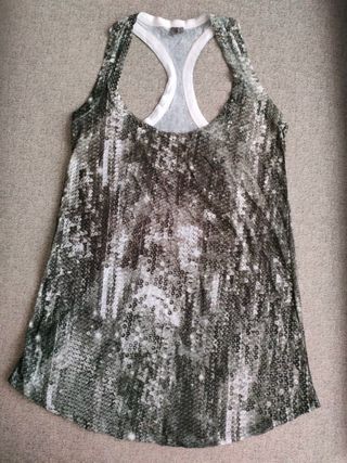 Camiseta estilo nadadora con estampado imitando lentejuelas. IMPORTANTE: No es de lentejuelas, es un estampado impreso. - Tiene un arreglo hecho en los tirantes por lo que aunque es talla S, podría valer para talla XS. - Tejido elástico. - Largo total de la prenda: 72cm.