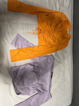 Pack de dos camisetas de manga larga. - Una camiseta de color naranja de tela estilo camisa. - Una camiseta de color lila asimétrica de polipiel