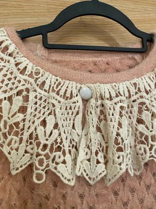 Precioso top de crochet hecho a mano con un diseño estilo coquette. Su delicado encaje en el cuello le da un toque muy especial. - Tejido suave y ligero. - Detalle de encaje en el cuello. - Diseño abierto tipo poncho. Top tejido a crochet y hecho a mano, estilo coquette / romántico. Color rosa con ribete beige clarito y volantes en el borde, súper delicado y femenino. Ideal para primavera/verano, festivales o looks aesthetic. • Talla: S/M (se adapta por el punto) • Estado: nuevo / sin estrenar (ajusta si aplica) • Hecho a mano con mucho detalle • Muy ligero y cómodo