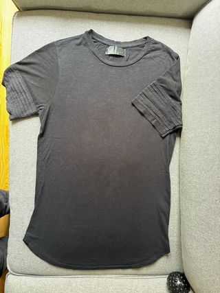 Camiseta de diseño en color negro, con un estilo moderno y detalles únicos en las mangas. - Mangas con pliegues. - Cuello redondo.
