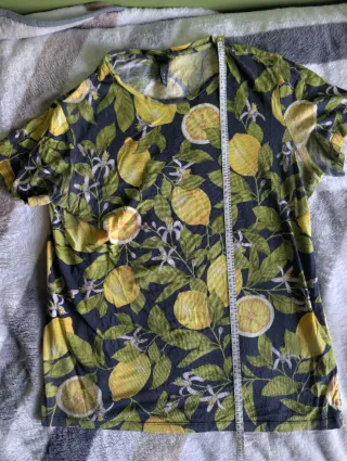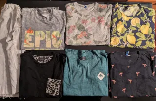 Pack de siete camisetas con estampados veraniegos. - Camiseta gris Jack & Jones con estampado do EPIC SHIT - Camiseta gris H&M con estampado floral. - Camiseta azul verdosa Bershka con parche de palmera. - Camiseta negra H&M con estampado de flamencos. - Camiseta negra Bershka con bolsillo leopardo. - Camiseta Zara sin mangas gris (estilo saco) - Camiseta azul marino con limones.