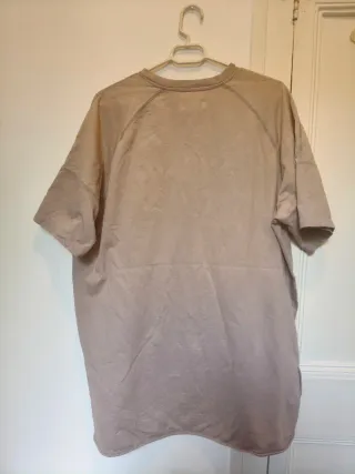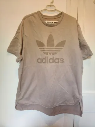 Camiseta adidas Originals auténtica, modelo "Vapour Grey" (Ref. AY8519). Es una prenda con un estilo muy urbano y minimalista. Características: Color: Vapour Grey (un tono beige/arena muy versátil). Diseño: Logotipo Trefoil clásico en el pecho a tono. Corte: Estilo oversize o relajado, con el dobladillo trasero ligeramente más largo que el delantero, lo que le da una caída muy original. Material: Algodón de alta calidad, muy cómodo. Estado: La camiseta está en muy buen estado general, muy bien cuidada. Aviso: Tiene un par de pequeñas manchas apenas perceptibles (ver últimas fotos), de ahí su precio reducido.