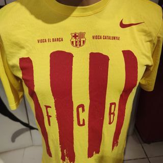 Camiseta FC Barcelona 2014-15 Nike – Talla S – Algodón – Senyera Vendo camiseta oficial del FC Barcelona temporada 2014-2015 de Nike. 🔹 Talla: S 🔹 Medidas: 48 cm de axila a axila / 72 cm de largo 🔹 Color: Amarillo con franjas rojas (estilo Senyera) 🔹 Material: 100% algodón 🔹 Estado: Buen estado general. Tiene algunos pequeños puntos desgastados por el paso del tiempo (ver fotos), pero está bien conservada. Diseño muy bonito con el escudo del Barça y el lema “Visca el Barça, Visca Catalunya!”. Ideal para coleccionistas o aficionados culés 💙❤️