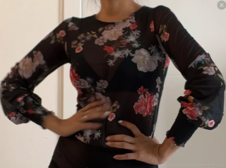 Blusa romántica con estampado floral sobre fondo negro. Diseño transparente con mangas largas abullonadas y puños elásticos. Blusa de Stradivarius en tejido de malla (mesh) elástico y semitransparente. Estampado floral sobre fondo negro, muy favorecedora y adaptable al cuerpo. Destaca por sus puños elásticos estilo nido de abeja que dan un volumen elegante a las mangas. - Tejido ligero y vaporoso. - Detalle de volantes en los puños.