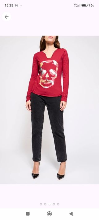 Preciosa camiseta de manga larga de la marca Zadig & Voltaire. Es de color rojo con un estampado de calavera en tonos plata y beige. - Tiene un corte favorecedor. - La tela se ve suave y cómoda. - Perfecta para un look casual con estilo. Talla XS