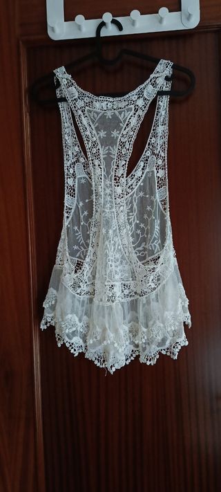 Bonita camiseta de encaje blanco, perfecta para un look bohemio o playero. - Diseño de encaje intrincado. - Estilo halter. - Acabado con volantes en el bajo.
