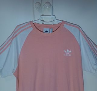 Camiseta Adidas estilo Y2K en color rosa- blanco - Diseño con las icónicas tres rayas en las mangas. - Logo bordado Adidas en el pecho. En muy buen estado Talla L Medidas 70cm de largo x 55cm de axila a axila