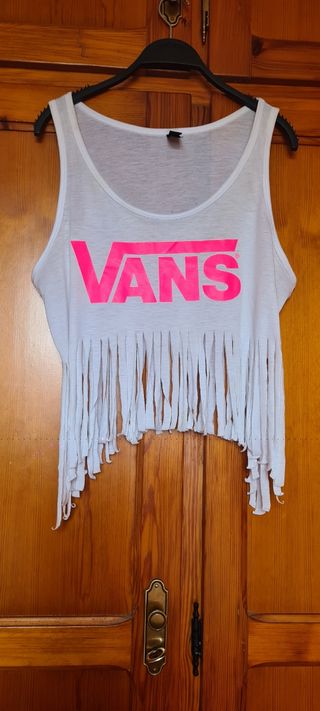 Top blanco con flecos. VANS en letras color rosa flúor. Es como un top crop pero con flecos (más largos en los laterales que en el centro). Es una talla M pero el estilo es holgado, es corto y holgado. De axila a axila mide 49-50 y de largo por el centro aprox 51 y por los laterales aprox 60. Muy chulo. Usada pero en buen estado.