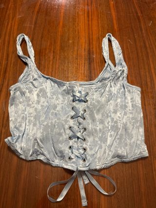 Precioso top estilo corsé en color azul, con un diseño floral texturizado y detalle de lazada frontal. - Tejido satinado con estampado floral. - Cierre de cordones en la parte delantera. - Tirantes finos. - Bajo con cordón ajustable.