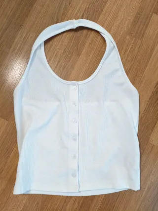 Camiseta de tirantes estilo halter, con un diseño acanalado y botones en la parte frontal. Es una prenda versátil y cómoda. Talla XL, marca Dazy. - Diseño acanalado. - Cierre de botones.