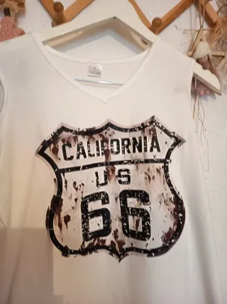 Camiseta blanca con un diseño gráfico de la mítica ruta California 66. - Estampado desgastado estilo vintage. preciosa con hombros descubiertos - Cuello en V. - Sin mangas.