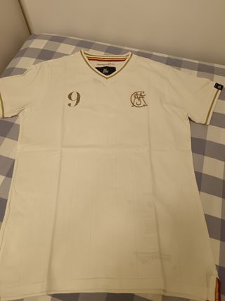 Camiseta del Real Madrid con detalles dorados y el número 9. Estilo Vintage y nueva - Diseño con cuello en V. - Escudo del equipo bordado. - Ribetes dorados en cuello y mangas.