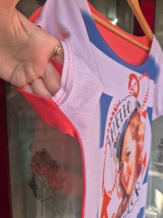 Camiseta de mujer de estilo marinero vintage, con estampación frontal “Hello Sailor” y diseño gráfico inspirado en la estética pin-up clásica. Diseño de manga corta y cuello redondeado, cómoda y favorecedora. Ideal para looks casuales, veraniegos o conjuntos con aire retro y desenfadado. 🔹 Talla estimada: L-XL (no consta etiqueta de talla; se incluyen medidas reales en las fotos para comprobar el ajuste) 🔹 Color: Multicolor 🔹 Estilo: Marinero / Vintage / Casual 🔹 Manga: Corta 🔹 Estado: Buen estado general, tal y como se aprecia en las fotografías 📏 Medidas reales incluidas en las fotos para mayor precisión.