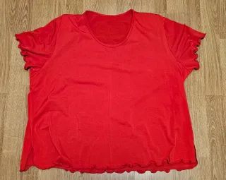 Camiseta de manga corta en un color rojo vibrante, perfecta para el día a día. Destaca por sus acabados ondulados (estilo lettuce trim) tanto en el borde de las mangas como en el bajo, lo que le da un toque muy femenino y original. Es de corte amplio y tiene una caída muy bonita. Marca: Eva S.C.P. Talla: SG (Talla Especial / Grande). Color: Rojo. Composición: 50% Poliéster y 50% Fibrana (viscosa), lo que la hace muy suave al tacto y fresquita. Estado: En perfectas condiciones. Cuidados: Lavar a máximo 30°C, admite plancha suave. No usar lejía ni secadora. #CamisetaRoja #TallaGrande #ModaCurvy #CamisetaFluida #RojoVibrante