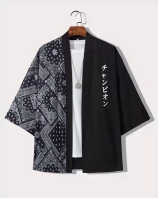 Camiseta de estilo kimono con un diseño llamativo y moderno. - Manga corta y corte holgado. - Estampado de paisley en un lado. - Inscripción en japonés en el otro lado.