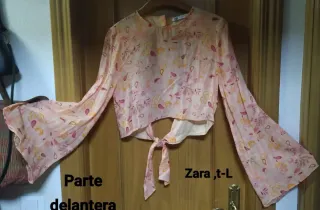 Blusa de Zara con un bonito estampado floral y de estilo bohemio . Manga larga acampanada.Diseño crop top con lazada delantera y escote en la espalda con pequeño botón . Tejido ligero y vaporoso. Nunca se usó .Nueva!