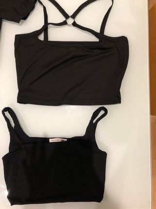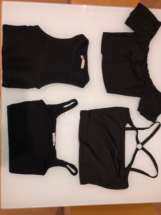Conjunto de cuatro tops negros, perfectos para el verano. Se encuentran en buen estado. - Diseño de tirantes. - Escote redondo. - Estilo sin mangas. - Un top con detalle de anillas en la espalda.