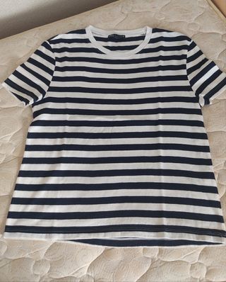 Camiseta de manga corta estilo marinera a rayas blancas y azul marino de Zara. Un básico de fondo de armario.