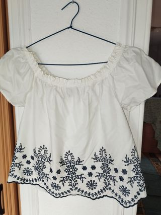 Camiseta estilo palabra de honor con mangas, con elástico. Talla 36 Usado 1 vez, está como nuevo. Si tiene alguna duda, no dude en preguntar. O si necesita más información.